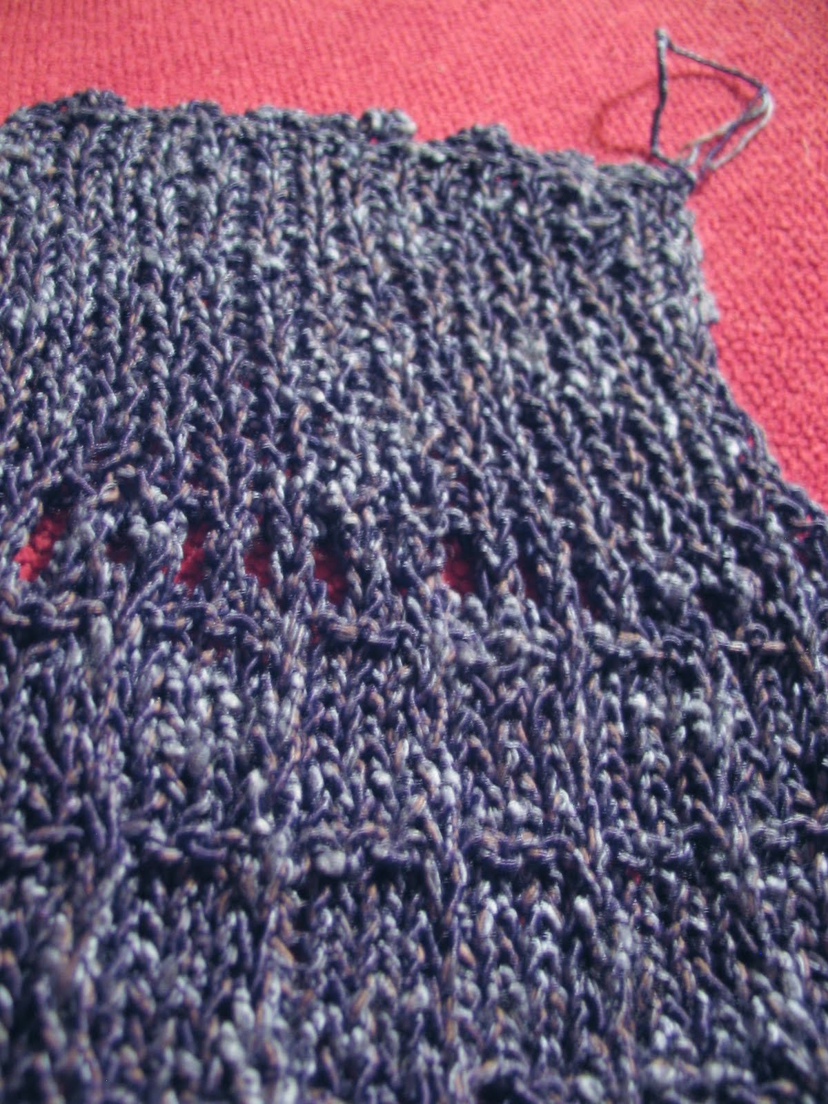 I like this yarn. The 3 core yarns are different colors so they create a tweedy effect as they peek through the black binder. The binder itself is shiny and gives the knitted fabric a sheen I failed to capture in the picture below. It makes a light fabric with nice drape that would be comfortable in warmer temperatures as well as air conditioned spaces. On #6 needles I got a gauge of 6.4 stitches to the inch in the textured pattern, so I'd need to adjust my needle size down to get the correct gauge, but not so much that it would significantly change the nature of the fabric produced.